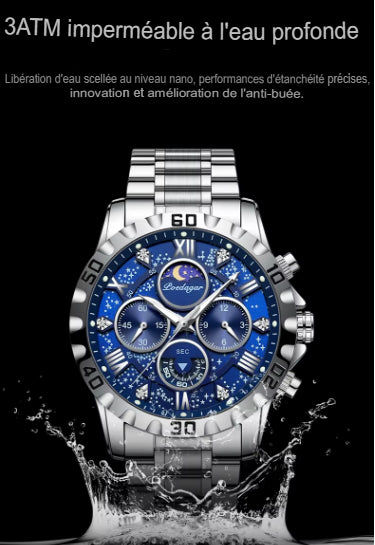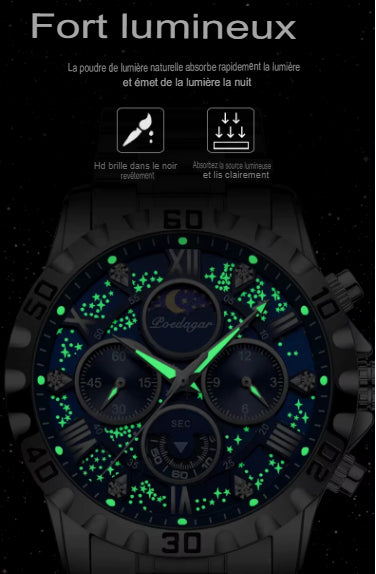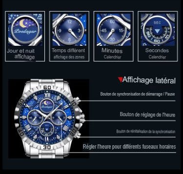 Conçue pour les hommes modernes qui recherchent à la fois performance et raffinement, elle se distingue par un design luxueux, une structure en acier inoxydable et un verre ultra-résistant aux rayures.